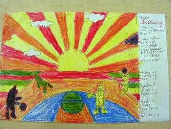 Vocabulary: Primary and Secondary colors. Mixing, Blending, Warm Colors (Sun, heat, noon day sky, hot, etc). Cool Colors (Evening Sky, clouds, water, etc). Horizon, Sun Rays, Rain Bows. Adding, math and the fact that zero have no value like the color white. Neutral Colors (White especially). Sky and the ground in relationship to warmth and coldness. Light verses dark. Horizon line and complete the drawing.