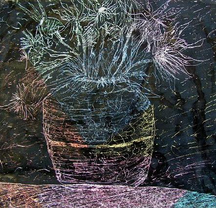 Students will be working in techniques of line, curves, etching and drawing. Using primary,