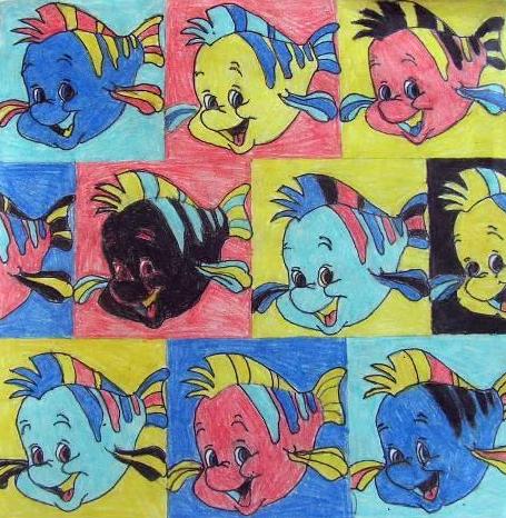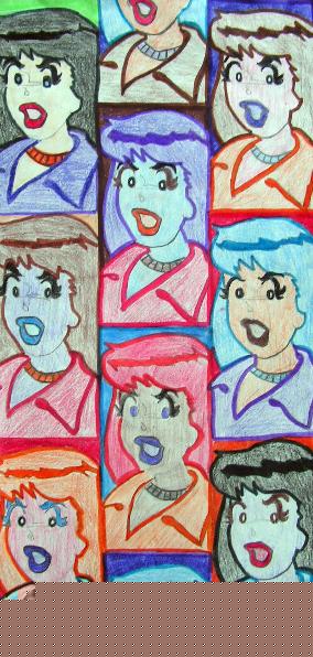 Strand: (Know about Art), (Making Art) and Elements of Art. Supplies Needed Tempera paint, 9” x 9” or 12” x 6” Construction or Manila Paper, Scissors and ruler. Steps 1. Students will develop and idea about their concept drawing and us that concept to draw a template drawing 3” x 3” or 4” x 2”. Explain to the students at this point the basic design concepts they will be using thought this project. Go over the explanation of Pop Art and the differences between Commercial Art. From their design template (much like a silk screen template). Andy Warhol Project; Art Fundamentals I Art Student, Eugene R-5, Missouri (Right) |