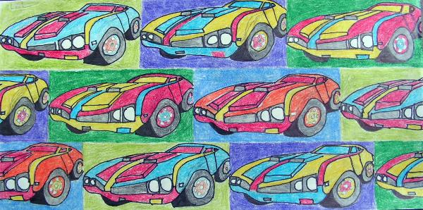 that are related to any colors that are on the basic stenciled patterns. Step 5. During the drawing process insure that the student makes contact with at least three side of the grid. This will allow for a full figured object within the parameters of the grid. Vocabulary: Andy Warhol, Commercial Art, Pop Art, Patterns, Grid(s), Half Drop, Alternating Pattern, Silk Screening, Marcel Duchamp, design pattern, screen template, basic stenciled patterns and neutral background.